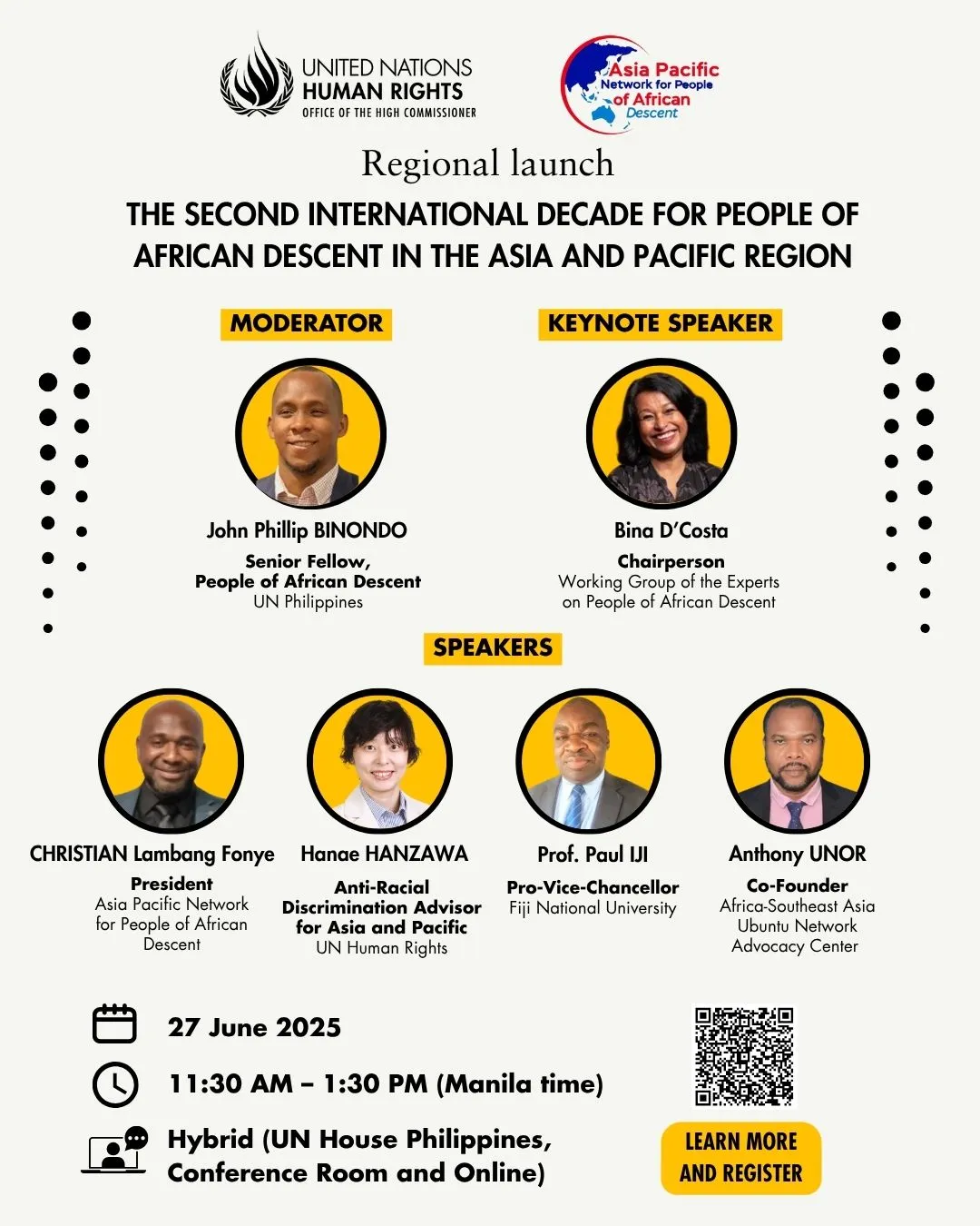 The UN Office of the High Commissioner for Human Rights (OHCHR) Regional Office for South-East Asia and the Asia Pacific Network for People of African Descent (APN) invite you to be part of a historic moment—the Regional Launch of the Second International Decade for People of African Descent in the Asia Pacific Region.