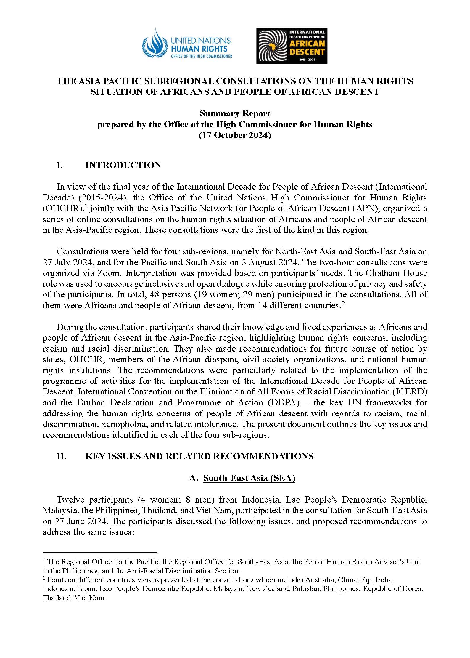 In order to inform OHCHR’s preparations and intervention at the high-level event to mark the closure of the Decade with the lived experiences and expertise of people of African descent, OHCHR, in partnership with the Asia Pacific Network for People of African Descent, organized four online consultations with representatives of people of African descent for four subregions of Asia and the Pacific.