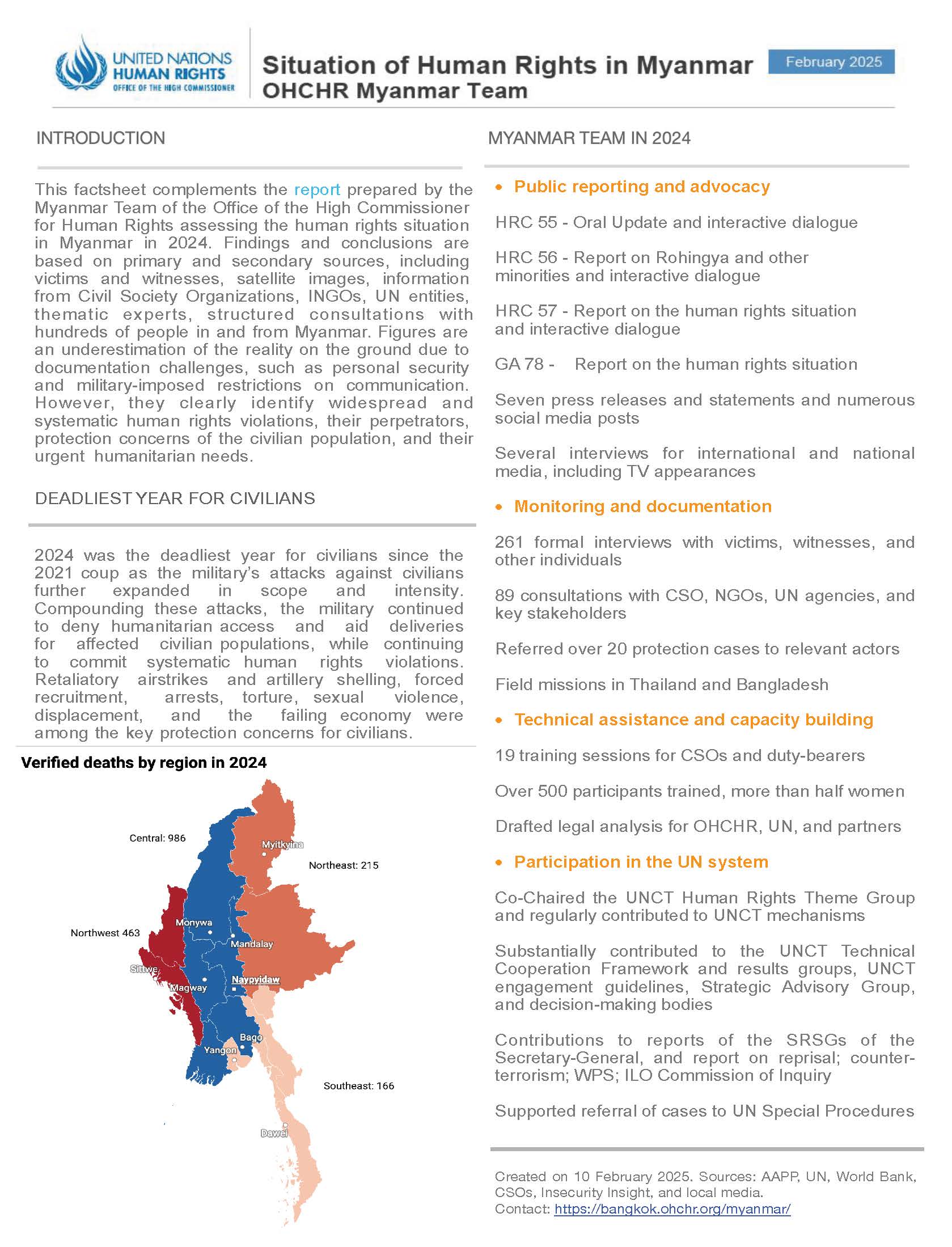The present report is submitted pursuant to Human Rights Council resolution 50/3, in which the Council requested the United Nations High Commissioner for Human Rights to report on the human rights situation in Myanmar at the seventy eighth session of the General Assembly. The report serves to identify trends and patterns of human rights violations in Myanmar between 1 February 2021 and 30 April 2023, with a focus on the human rights impacts as a result of the denial of humanitarian access. The present comprehensive documentation is further supplemented by data on the situation of human rights and humanitarian access in Rakhine State after Cyclone Mocha in May 2023
